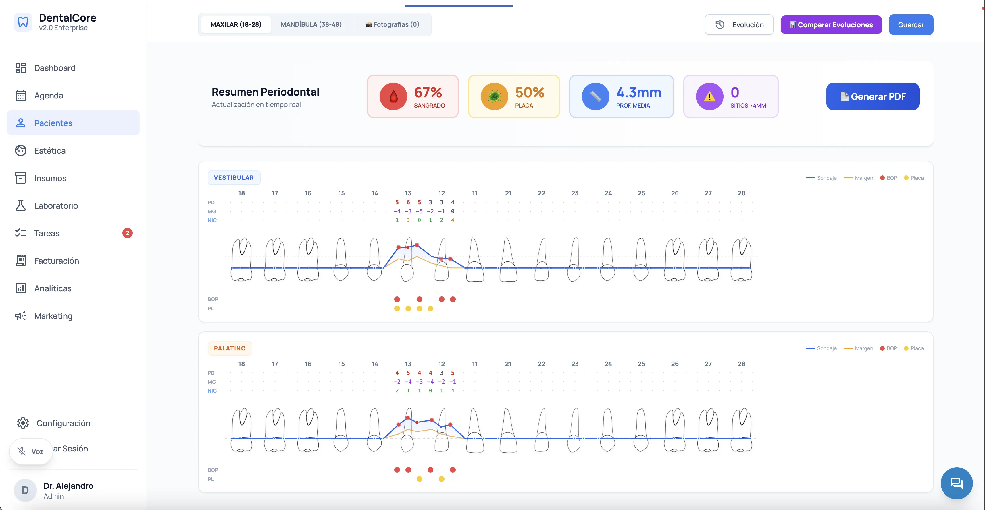 Registrá sondaje, sangrado, placa y margen en 6 sitios por pieza. Compará snapshots entre fechas y mostrá la evolución al paciente con datos reales.