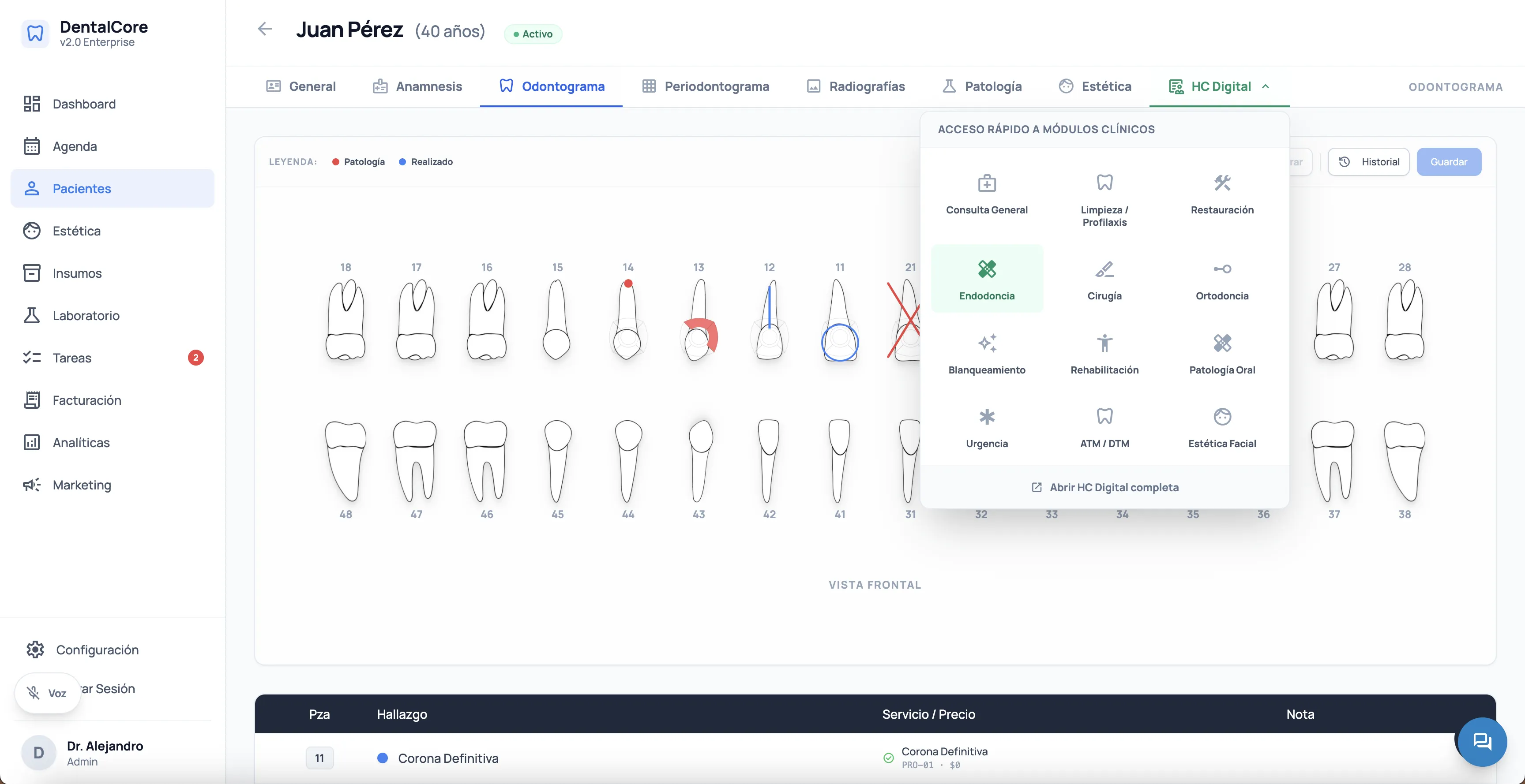 No es un formulario genérico. Cada área de la odontología tiene su propio workflow paso a paso: desde el diagnóstico hasta el alta. Odontograma interactivo, periodontograma con evoluciones comparativas, y módulos especializados con lógica clínica real.